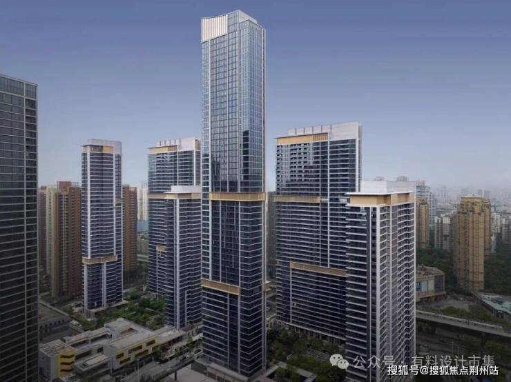 立面设计汲取长江流动水韵的灵感,以风帆造型营造出极具辨识度的塔冠设计。定制的鎏金腰线既以「鎏光织锦」雕琢高定美学立面,更借起伏曲线暗合奔涌江潮之势——将长江「云奔潮涌、勇立潮头」的进取精神,凝练为武汉瑞府的城市精神图腾。