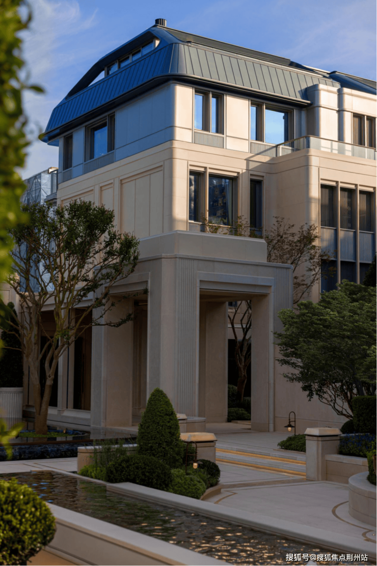 老桩紫薇对植,翡翠蓝石材水景倒映天光,形成浮光掠影的艺术画面。