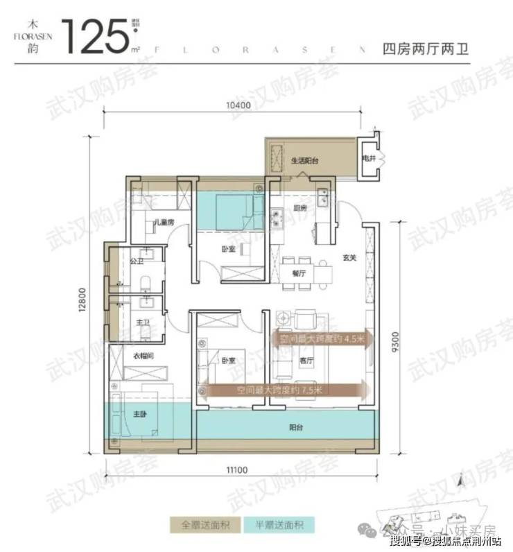 汉阳城更·花木深目前公示了5个户型,分别是100、104、109平的三房两卫,以及125、145平的四房两卫。
