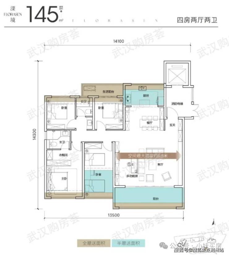 建面约145平四房户型