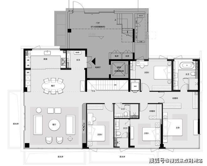 整体户型设计两梯两户,四房两厅三卫,空间阔绰、居住舒适。