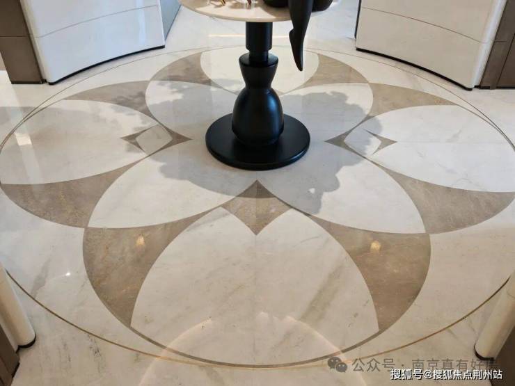 摒弃工业化的机械切割,每片“花瓣”用石材原生脉络手工定位、水刀精雕,确保纹理自然流淌。晨光熹微时,地面泛起温润光泽,仿若一朵玉兰在晨露中初绽。