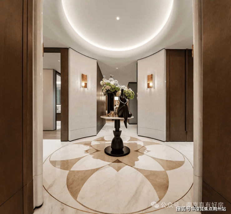 墙面艺术:玄关处墙面由皮革软包升级成弧度造型的卡里冰玉石,浅色石材肌理形似凝固的江南烟雨,浅灰基底中游弋着乳白丝絮,触手生温。