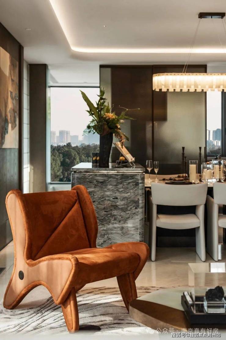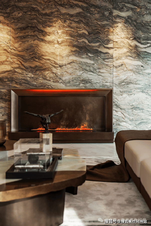 美学表达上,『鎏光』样板间以深褐木饰面+浅灰奢石为基调,客厅背景墙的雪山银狐岩板复刻《千里江山图》意境,地面雅柏灰奢石则以天然纹理呈现山水长卷的流动感,让东方美学在当代奢宅中焕发新生。