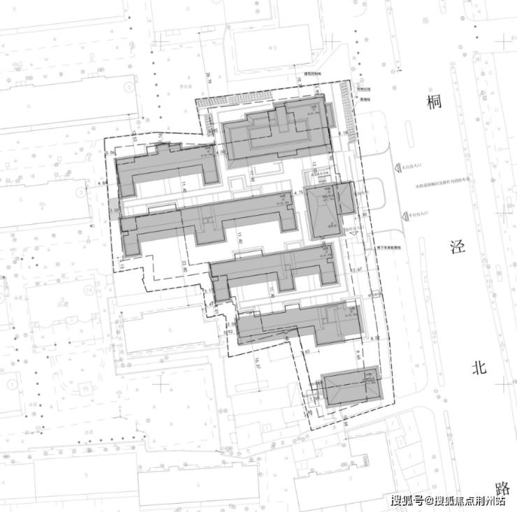 容积率1.2,拟建5栋3-7F住宅,其中4栋3F联排,及1栋7F洋房,小区在桐泾北路设有出入口。