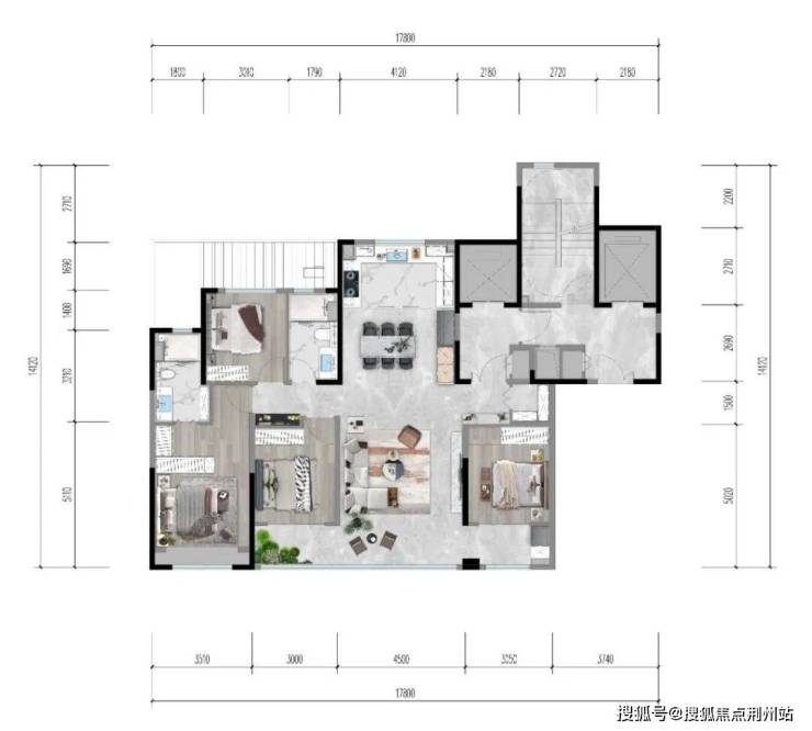 175平两梯两户,每户都有各自的电梯前厅,子母门入户,玄关还带着800库储藏室。整体户型四面宽朝阳,开间超16米,带着8.85米的落地窗大阳台和将近6米的大宽厅。还是双主卧套房设计,端户户型还规划设计有270度的拐角大飘窗。