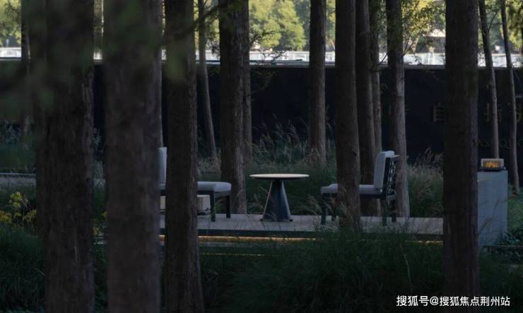 林下吧台 - 水杉疏枝轻笼着灰调铺装,深灰肌理与树阵错落交织,极简坐凳嵌在林间,是独属于都市的静谧留白。