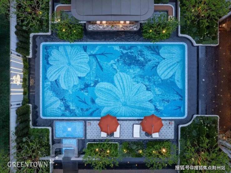 泳池底部海棠花影美轮美奂,两侧乌桕矗立,4棵铁冬青分列泳池四周,超7米宽泳池社交吧台、下沉围坐区,对望超16米宽跳泉叠瀑,瞬间把松弛感拉满。至此,不得不感叹,只有绿城能给到一个首改社区如此绝美的归家序曲。
