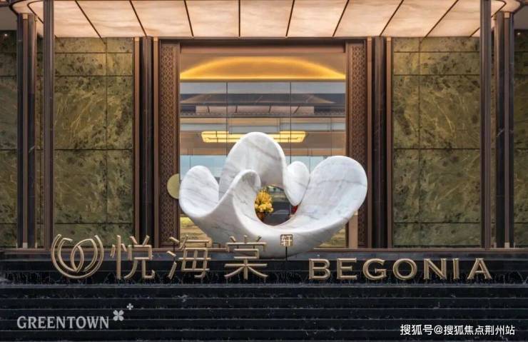 主入口“学院派”门厅,长约45米,采用双C环抱式造型,设计灵感源自西湖大学,两侧约7米高宝格丽绿奢石景墙,搭配汉白玉奢石海棠雕塑,超强气场扑面而来。