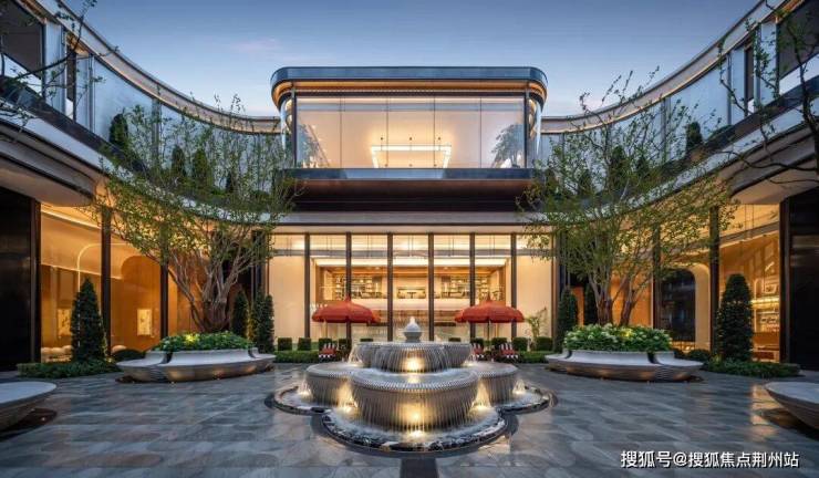 以入院见院,搭配写意回廊设计,为业主营造眺望庭院美景的最佳观景台和止歇之处。站在回廊上,俯瞰下沉式庭院,这里水花飞溅,4棵紫薇树对称排布,既新奇又有游园之趣。