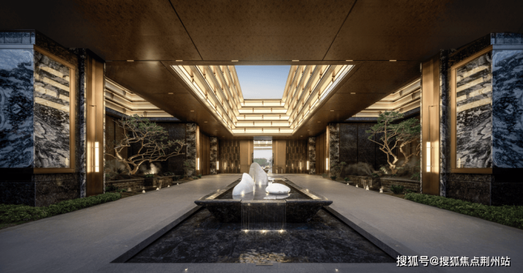 中心华盖之下,是汉白玉整石为主景的叠水,寓意着藏风聚气又纳财;左右两边的华盖下方,则做了诗意的堆坡造景,两棵铁冬青就像展品一样精致。