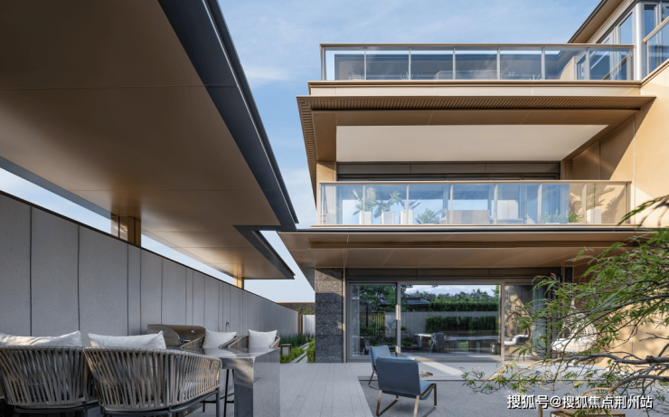 合院产品以香槟金铝板、银珠黑石材与深灰色铝板,勾勒出简约现代的线条。大面积玻璃的运用,营造出通透落地的极致视野,让建筑自然交融;点睛之笔的陶土瓦坡屋面,于现代肌理中流淌出东方的静谧与尊贵。