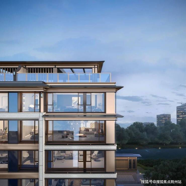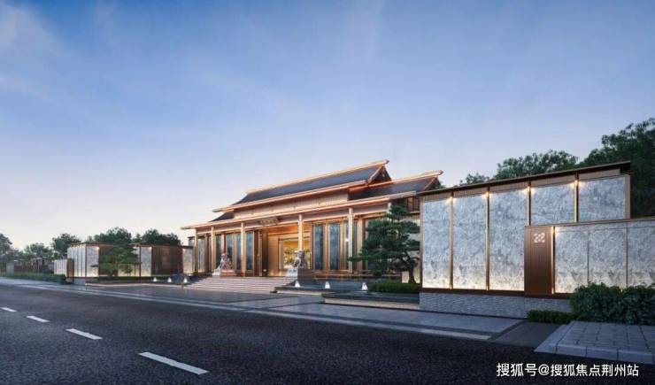 项目采用石材立面与铝板幕墙结合,顶部曲角飞檐、中部金色铝板点缀、基座石材装饰,以横向与竖向的米白色石材线条构建主体框架,展现宋式雅居的韵律美感。