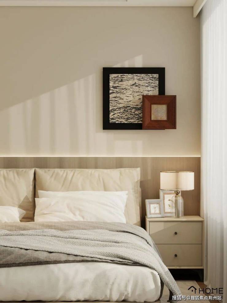 主卧延续了整体的温润调性,以「舒适睡眠」为核心,打造了一个静谧的休憩空间。悬浮式床头背景墙搭配木质护墙板,既弱化了墙面的厚重感,又通过暗藏灯带营造出柔和的氛围光,夜晚躺在床上,仿佛被温柔的光线包裹,能快速卸下疲惫。
