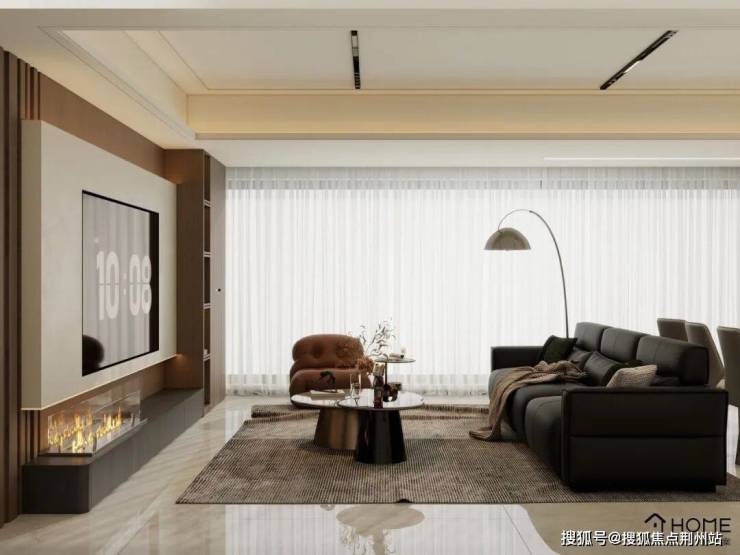 大面落地窗搭配半透纱帘,将自然光温柔地引入室内,黑色皮质沙发与焦糖色单人椅形成材质与色彩的对比,既满足了多人聚会的需求,又为独处时光预留了舒适角落。圆形茶几的设计弱化了棱角,搭配肌理感地毯,让客厅成为家人围坐聊天、孩子嬉戏玩耍的核心场域