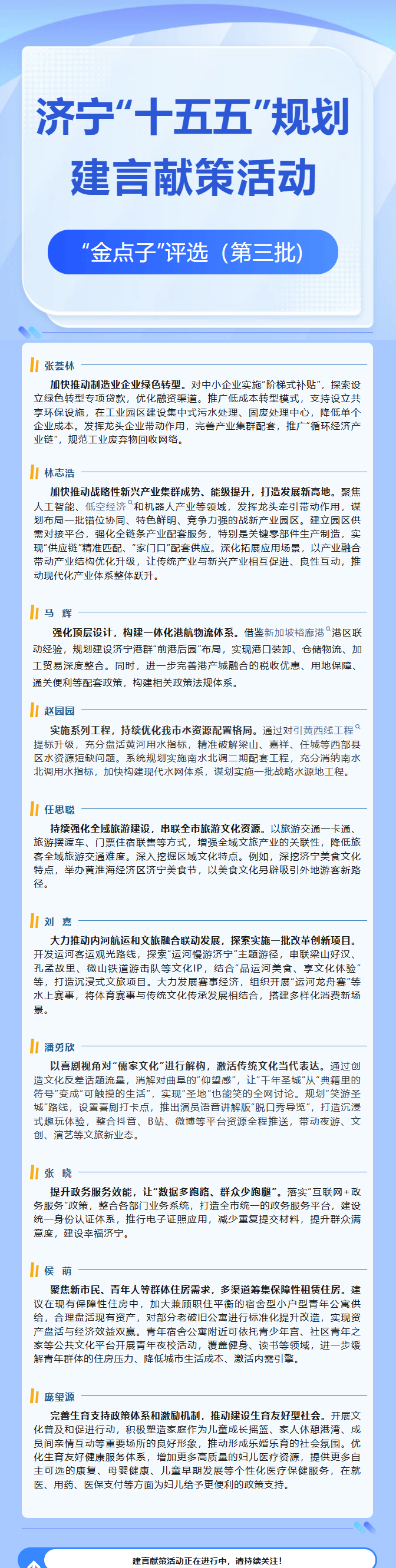 近日,济宁市“十五五”规划建言献策活动第三批“金点子”发布。
