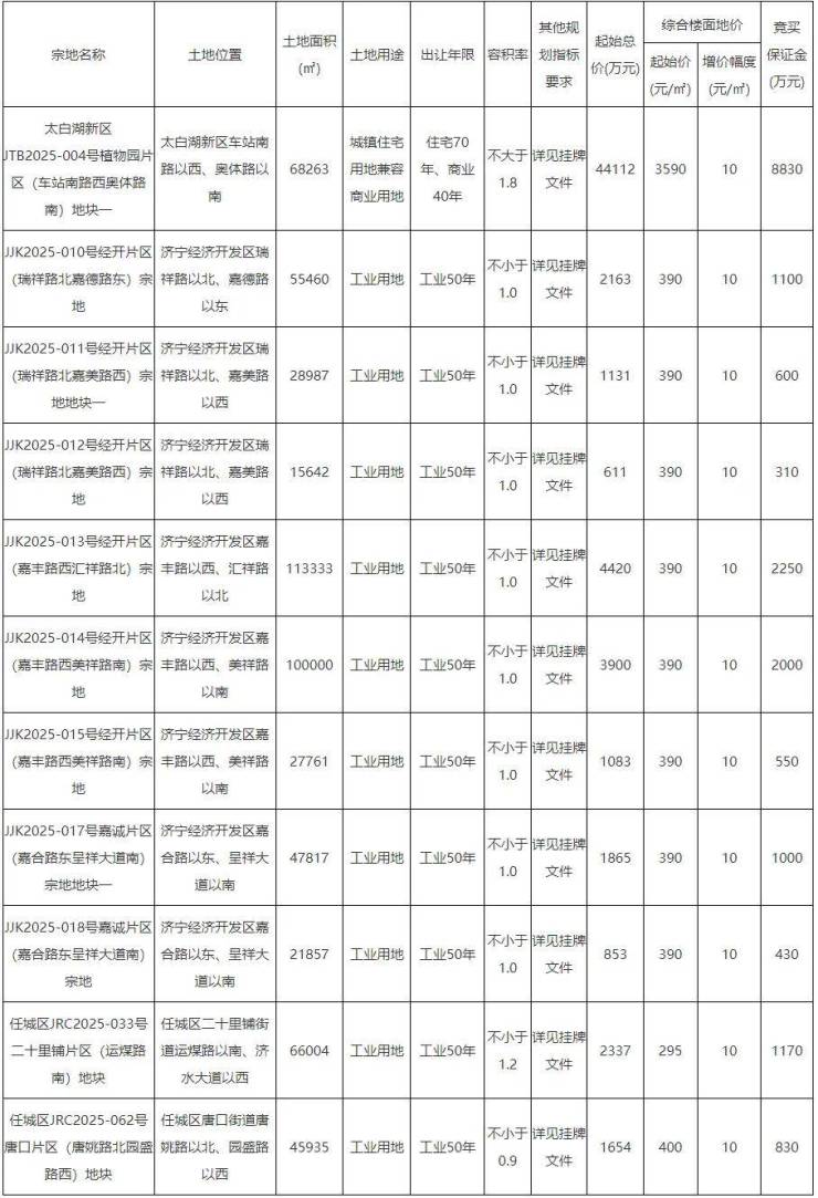 从11宗地块的具体分布上看,太白湖新区1宗、任城区2宗、济宁经开区8宗。从土地用途来看,1宗城镇住宅用地兼容商业用地、10宗工业用地。土地总面积为591059㎡,约887亩;总起始价为64129万元。