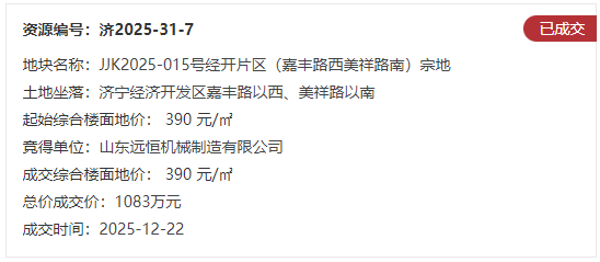 地块七:JJK2025-015号经开片区(嘉丰路西美祥路南)宗地【山东远恒机械制造有限公司竞得】
