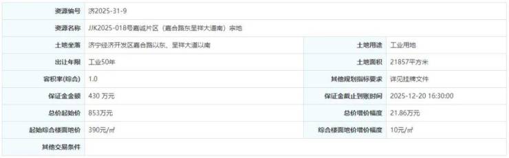 土地位于:济宁经济开发区嘉丰路以西、美祥路以南;土地面积:27761㎡(约42亩);土地用途:工业用地;出让年限:50年;容积率不小于1.0;起始价:1083万元,综合楼面价起价:390元/㎡;最终成交价为:1083万元(约26万元/亩),综合楼面地价成交价:390元/㎡;溢价率:0.0%;