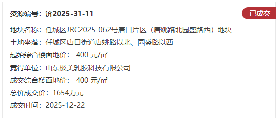 地块十一:任城区JRC2025-062号唐口片区(唐姚路北园盛路西)地块【山东极美乳胶科技有限公司竞得】