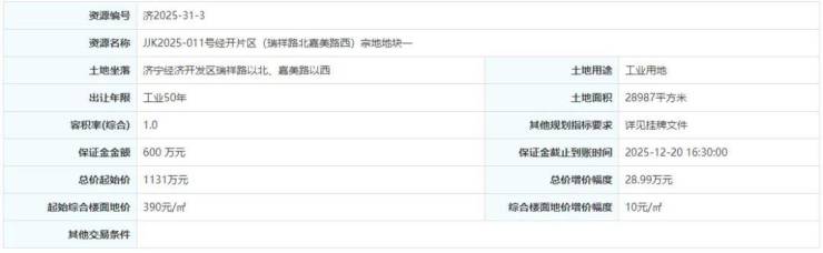 土地位于:济宁经济开发区瑞祥路以北、嘉美路以西;土地面积:28987㎡(约44亩);土地用途:工业用地;出让年限:50年;容积率不小于1.0;起始价:1131万元,综合楼面价起价:390元/㎡;最终成交价为:1131万元(约26万元/亩),综合楼面地价成交价:390元/㎡;溢价率:0.0%;