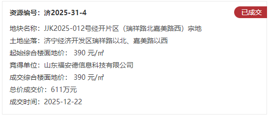 地块四:JJK2025-012号经开片区(瑞祥路北嘉美路西)宗地【山东福安德信息科技有限公司竞得】