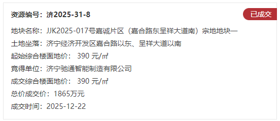 地块八:JJK2025-017号嘉诚片区(嘉合路东呈祥大道南)宗地地块一【济宁驰通智能制造有限公司竞得】