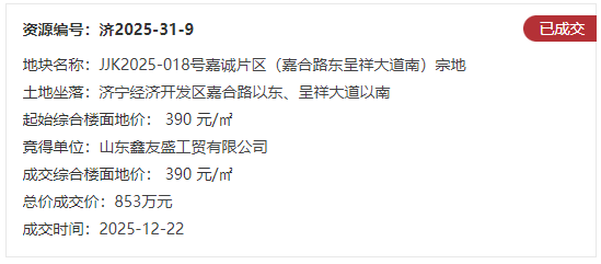土地位于:济宁经济开发区嘉合路以东、呈祥大道以南;土地面积:21857㎡(约33亩);土地用途:工业用地;出让年限:50年;容积率不小于1.0;起始价:853万元,综合楼面价起价:390元/㎡;最终成交价为:853万元(约26万元/亩),综合楼面地价成交价:390元/㎡;溢价率:0.0%;