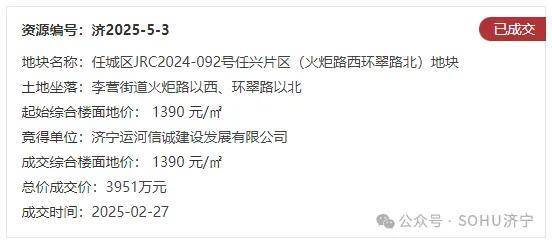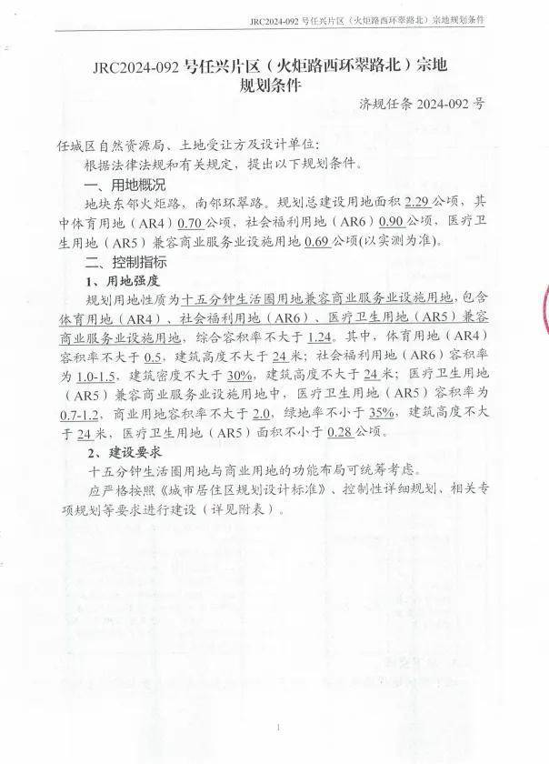 地块名:任城区JRC2024-092号任兴片区(火炬路西环翠路北)地块【济宁运河信诚建设发展有限公司竞得】
