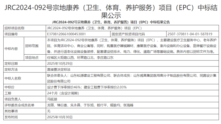 2025年9月29日,JRC2024-092号宗地康养(卫生、体育、养护服务)项目(EPC)招标公告发布。