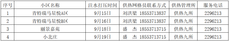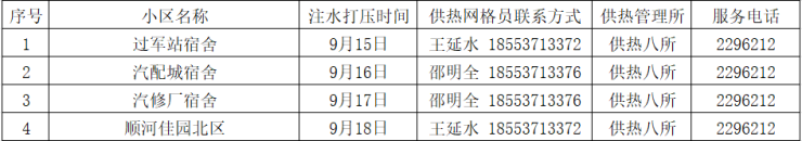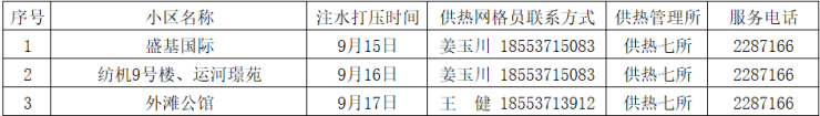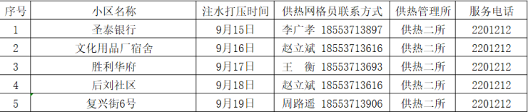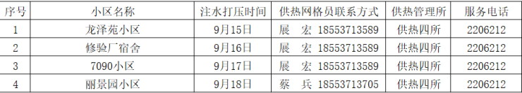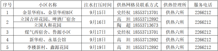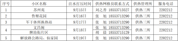 为了做好今冬供热准备工作,济宁四和供热有限公司定于9月15日(周一)开始进行注水试压工作,请用户留意小区内注水试压通知,具体注水试压时间以小区内张贴通知为准。注水试压期间务必家中留人,自行检查室内暖气设施的完备情况,以防注水试压期间出现漏水浸泡等事故,注水试压期间如遇紧急情况或公共区域漏水可拨打热线电话96655、5668060或供热管理所服务电话。注水试压后,管道系统内将保持压力,为了保证供热效果及管网安全请不要私自放水。