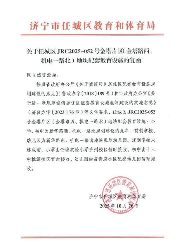 该项目位于任城区南张街道机电一路北、新华路西,建设用地42300平方米,规划建设小学部、中学部等全功能校舍,容积率、绿地率等指标均符合义务教育学校建设规范。其选址与任城区教体局2025年10月复函明确的金塔片区配套九年一贯制学校完全一致,二者服务范围、建设阶段高度契合,虽官方未直接等同命名,实为同一教育配套工程的不同表述。