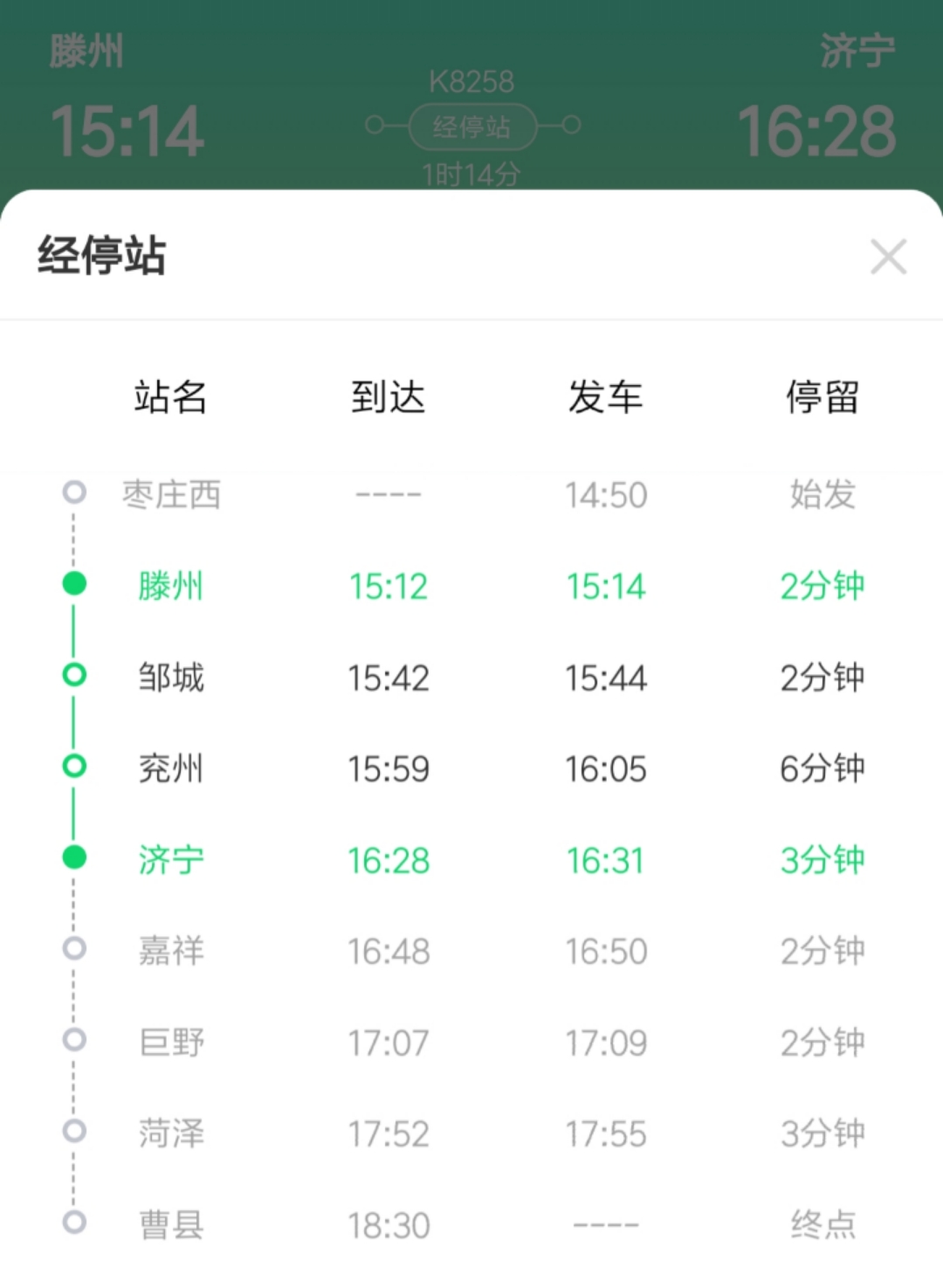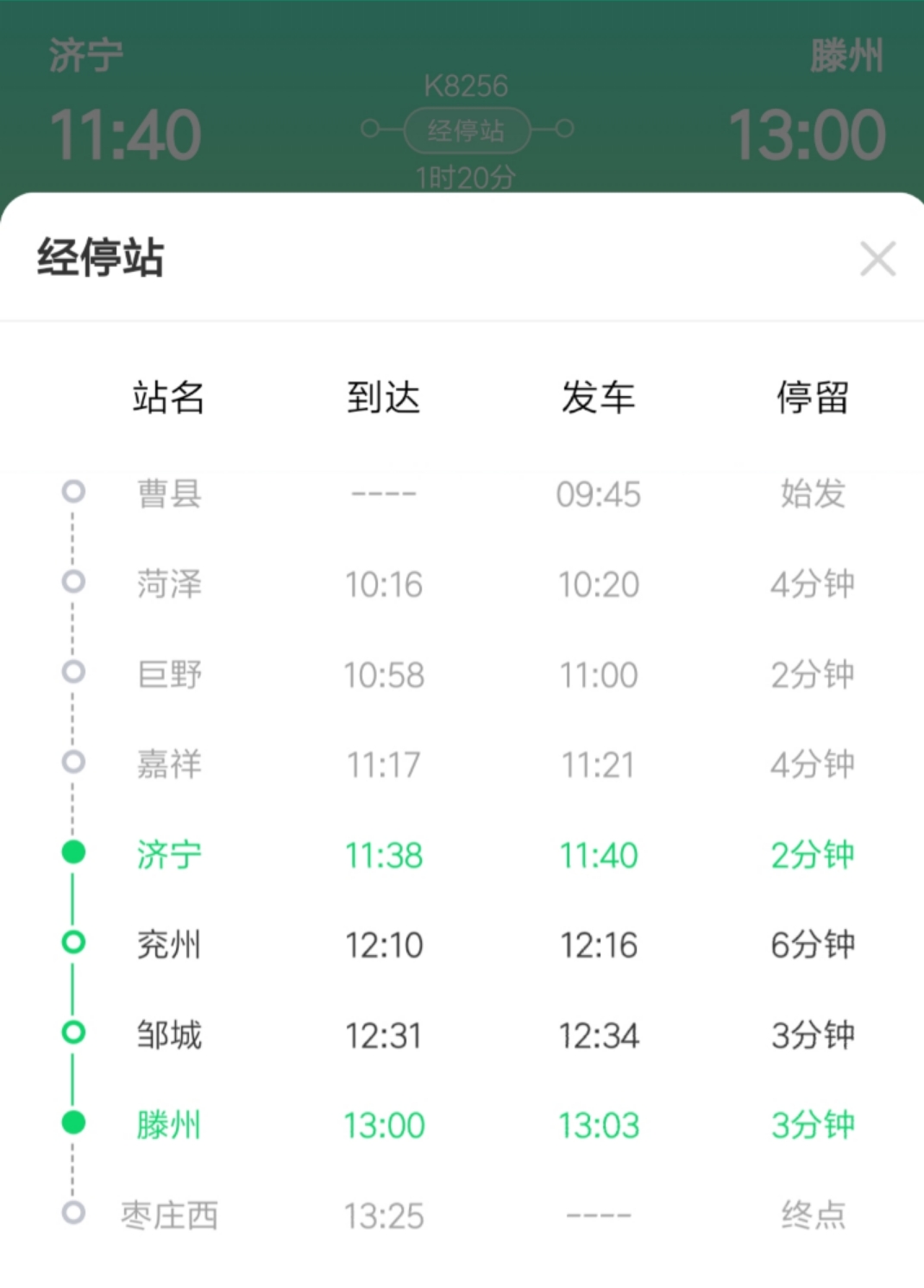 列车全程运行时间3小时40分钟,在济宁地区经停站有4个:嘉祥、济宁、兖州、邹城。该线路的开通标志着济宁首次有了直达滕州的火车。K8256次济宁到滕州的发车时间是11:40,到达滕州的时间是13:00;K8258次滕州到济宁的发车时间是15:14,到达济宁的时间是16:28。