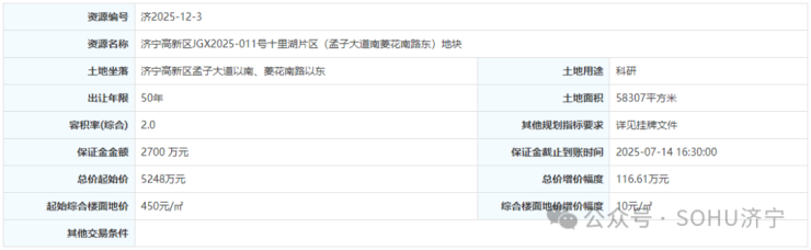 土地位于:济宁高新区孟子大道以南、菱花南路以东;土地面积:58307㎡(约88亩);土地用途:科研用地;出让年限:50年;容积率不大于2.0;起始价:5248万元,综合楼面价起价:450元/㎡;