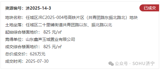 地块三:任城区JRC2025-004号高铁片区(共青团路东振北路北)地块【山东鑫声玉城置业有限公司竞得】