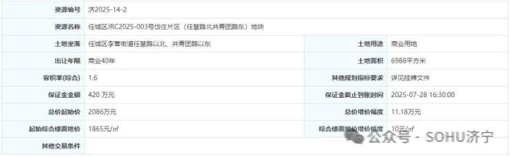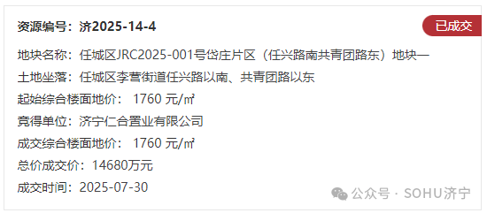 地块四:任城区JRC2025-001号岱庄片区(任兴路南共青团路东)地块一【济宁仁合置业有限公司竞得】
