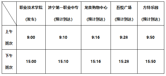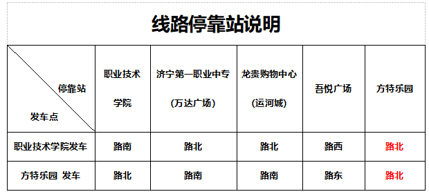 运营路线: 职业技术学院 ⇄ 济宁第一职业中专 ⇄ 龙贵购物中心⇄ 吾悦广场 ⇄ 方特乐园