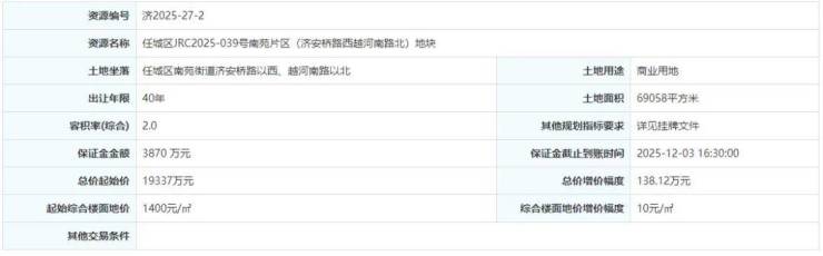 土地位于:任城区南苑街道济安桥路以西、越河南路以北;土地面积:69058㎡(约104亩);土地用途:商业用地;出让年限:40年;1.5-2.0;起始价:19337万元,综合楼面价起价:1400元/㎡;最终成交价为:19337万元(约186万元/亩),综合楼面地价成交价:1400元/㎡;溢价率:0.0%;