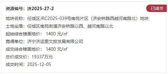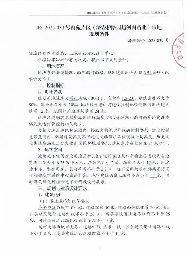 地块名:任城区JRC2025-039号南苑片区(济安桥路西越河南路北)地块【济宁济运里文旅发展有限公司竞得】