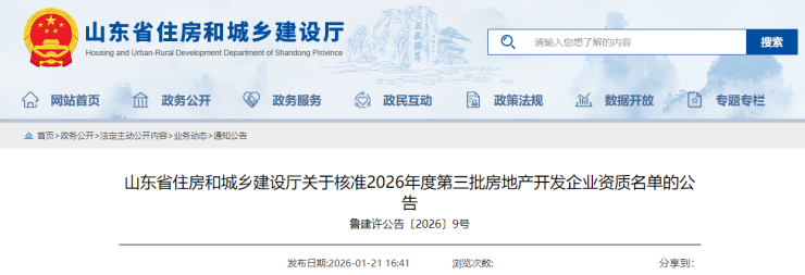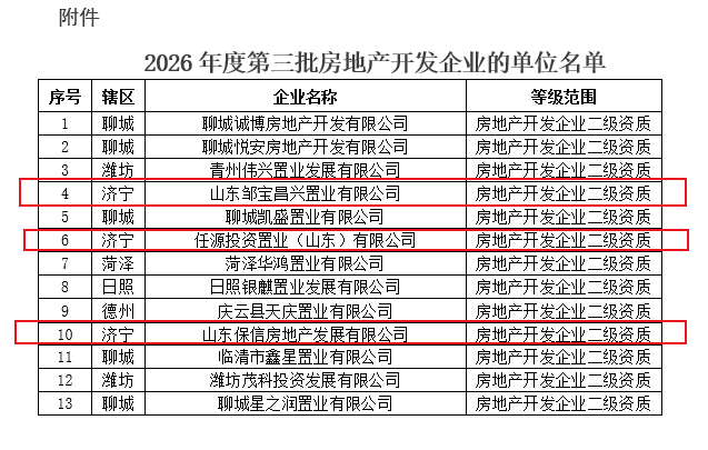 近日,搜狐网济宁小编了解到:根据《关于修改<房地产开发企业资质管理规定>的决定》(住房和城乡建设部令第54号)及有关实施要求,山东省住房和城乡建设厅对2026年度第二批房地产开发企业资质的审查意见进行了公示,现将核准的名单予以公告。