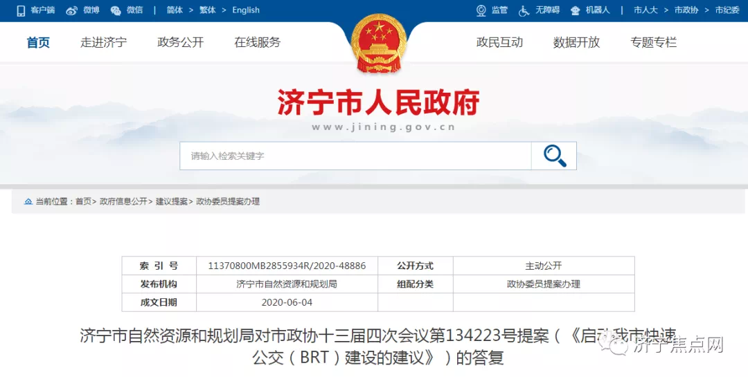 搜狐新闻·搜狐焦点济宁小编注意到在济宁市人民政府网站上有了济宁市自然资源和规划局对市政协十三届四次会议第134223号提案(《启动我市快速公交(BRT)建设的建议》)的答复。全文具体如下: