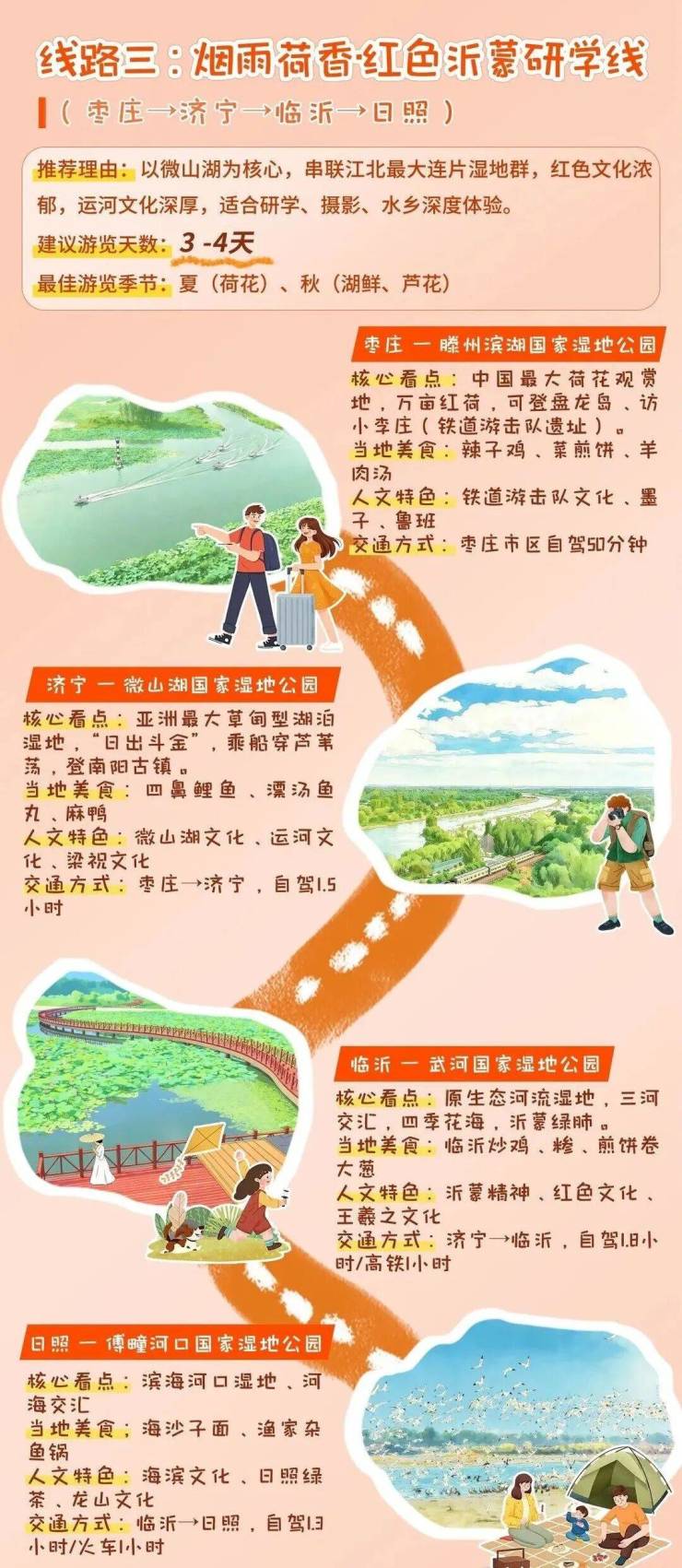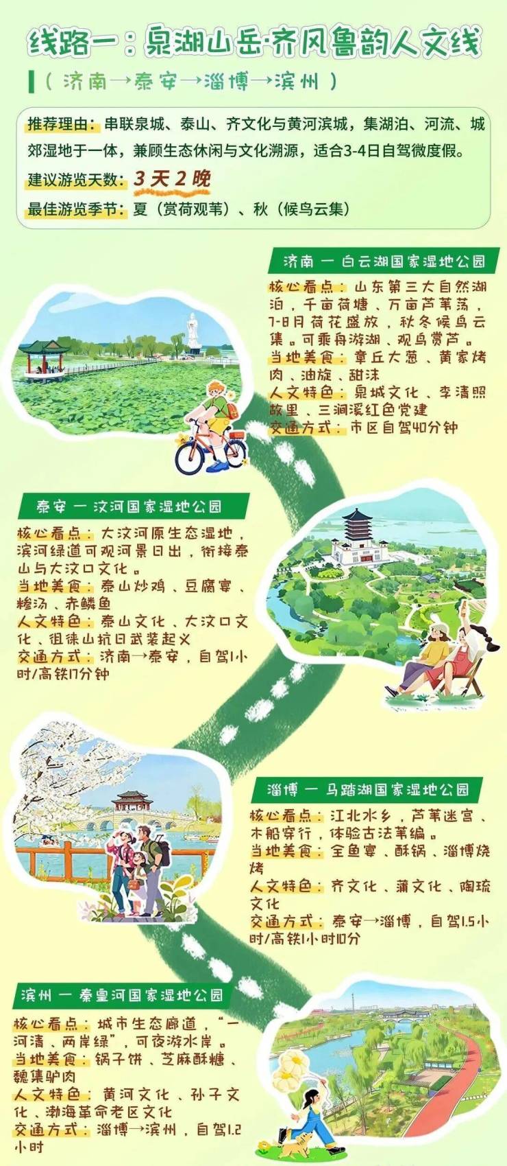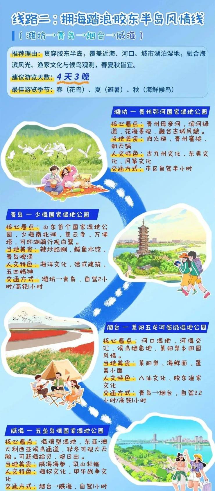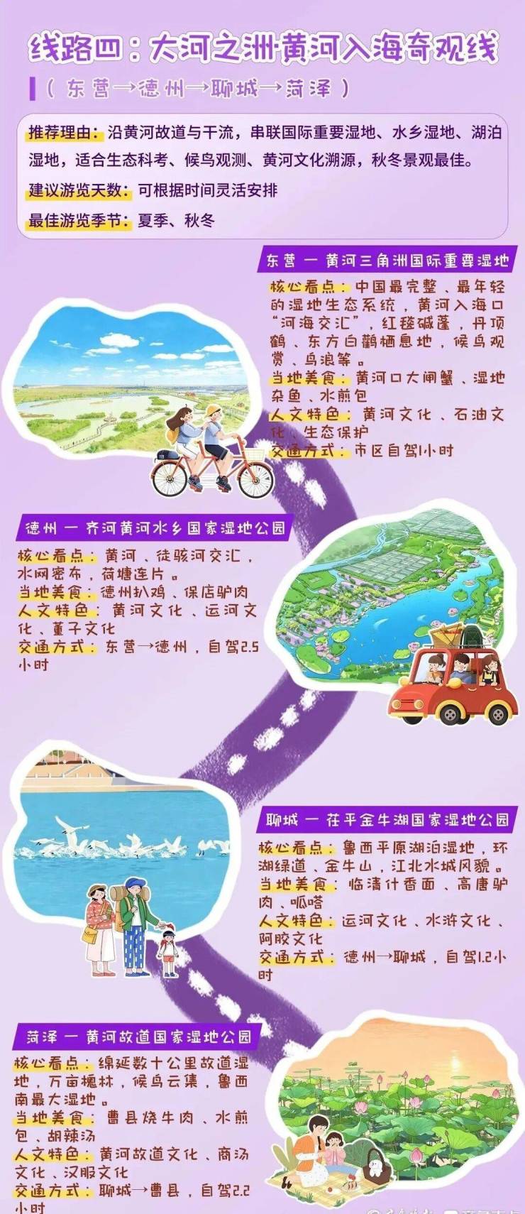 2026年4月13日至19日,山东迎来第二个湿地保护宣传周。今年宣传周期间,山东面向公众发布4条湿地主题生态旅游推荐线路,涵盖泉湖山岳·齐风鲁韵人文线、拥海踏浪·胶东半岛风情线、烟雨荷香·红色沂蒙研学线、大河之洲·黄河入海奇观线,串联起全省特色湿地资源与人文景观,为公众亲近湿地、体验湿地提供清晰指引。
