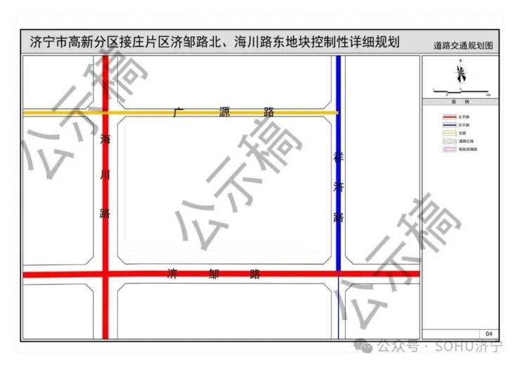道路红线:海川路红线宽度62米,济邹路红线宽度50米,祥济路红线宽度36米,广源路红线宽度20米。