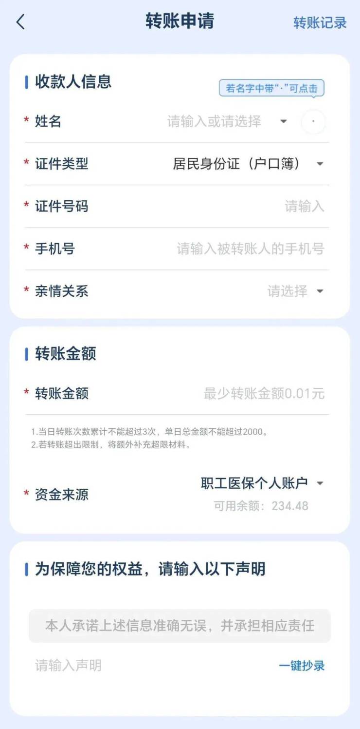 1.每个医保钱包账户单日限额三笔转账,每笔转账金额不超过2000元,每日22:00—次日6:00不能进行转账。