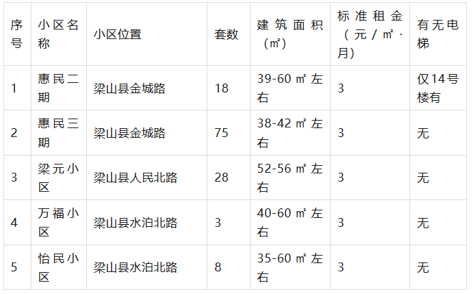 1、梁山县公共租赁住房租金标准按照梁山县发展和改革局《关于梁山县公共租赁住房租金标准的批复》(梁发改〔2025〕22号)执行,即:3元/月建筑平方米;