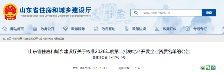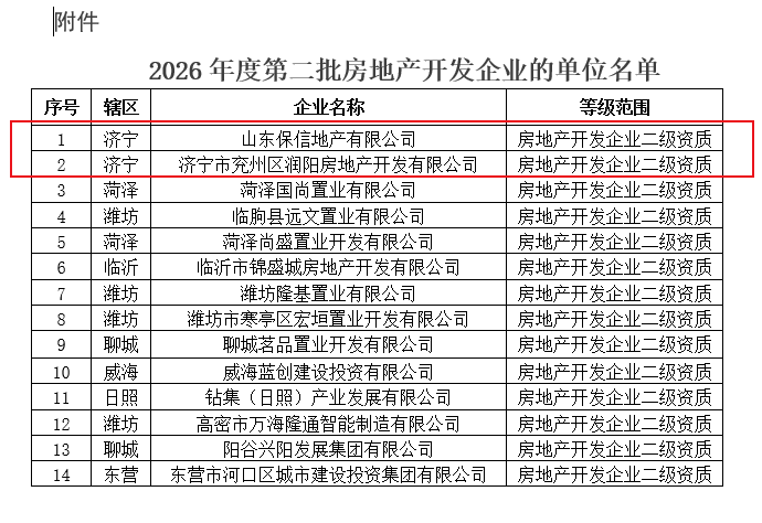 近日,搜狐网济宁小编了解到:根据《关于修改<房地产开发企业资质管理规定>的决定》(住房和城乡建设部令第54号)及有关实施要求,山东省住房和城乡建设厅对2026年度第一批房地产开发企业资质的审查意见进行了公示,现将核准的名单予以公告。