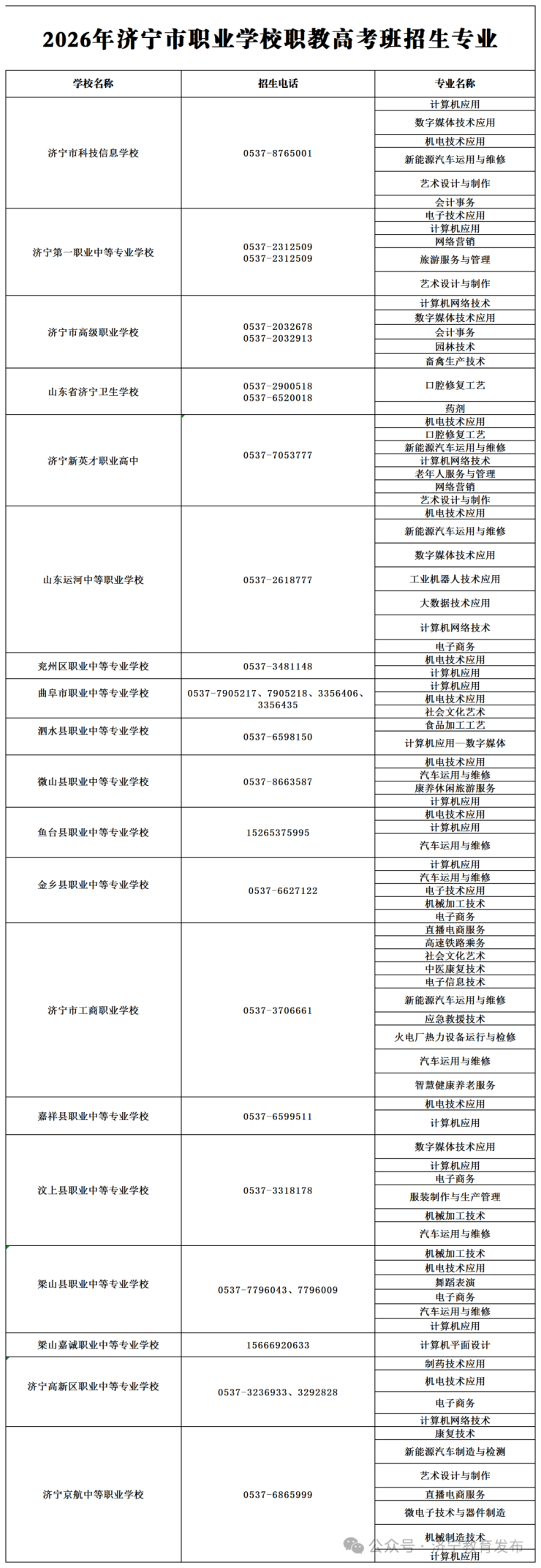 为深入贯彻落实国家关于推动职业教育高质量发展、拓宽学生成长成才通道的决策部署,山东省已全面推开职教高考政策,为学生提供了更加灵活、多元的升学路径。职教高考和夏季高考各有其核心价值,每个孩子的学业基础和人生规划各不相同,升入本、专科大学的道路也并非只有一条。现就2026年济宁市中等职业学校“职教高考班”招生工作有关事项作如下解读: