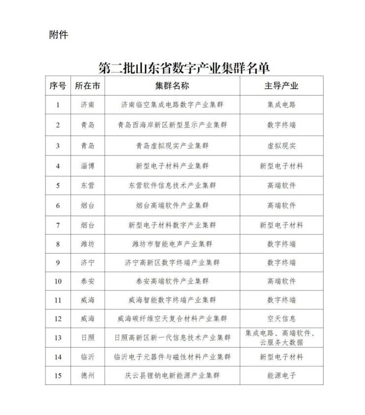 为全力塑强一批以数字产业“十大工程”为主导的数字产业集群,全面提升数字经济发展核心竞争力,促进我省数字产业高质量集聚发展,省工业和信息化厅组织开展了第二批山东省数字产业集群申报工作。经各单位申报、各市推荐、专家评审和网上公示等程序,认定济南临空集成电路数字产业集群等15个集群为第二批山东省数字产业集群,现将名单予以公布。