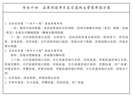 构建沿黄河城市片区交通网主骨架。沿黄河城市片区包括省会经济圈的济南、淄博、东营、泰安、德州、聊城、滨州7市及鲁南经济圈的济宁、菏泽2市。重点以济南为中心,完善济南-德州、济南-滨州(东营)、济南-淄博、济南-莱芜、济南-泰安、济南-聊城6条放射状通道和德州-滨州-淄博-济南(莱芜)-泰安-聊城-德州环形通道,加快构建“环米字形”综合交通运输主骨架。规划以济南为核心的“一环十一射”高速铁路、“两环十六射”高速公路布局,济南与周边市实现“高铁双通道”,高速公路实现“县县连省会”,打造省会半小时交通圈。强化省会经济圈与济宁、菏泽地区交通连接,以济南为引领,推动形成以沿黄高铁、沿黄两岸双高速为骨架的沿黄达海综合运输通道,提升与京津冀、中原城市群省际通道能力,支撑沿黄河城市片区高质量发展,打造黄河流域生态保护和高质量发展引领区、全国区域一体化发展示范区。