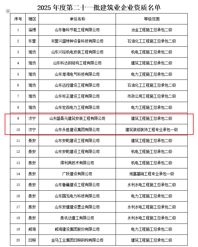 搜狐网济宁小编了解到:近日,山东省住房和城乡建设厅发布关于2025年度第二十一批建筑业企业资质名单的公告,根据《建筑业企业资质管理规定》(住房城乡建设部第22号令)及有关实施要求,山东省住房和城乡建设厅对2025年度第二十一批建筑业企业资质的申请材料进行了公示,现将核准的名单予以公告。